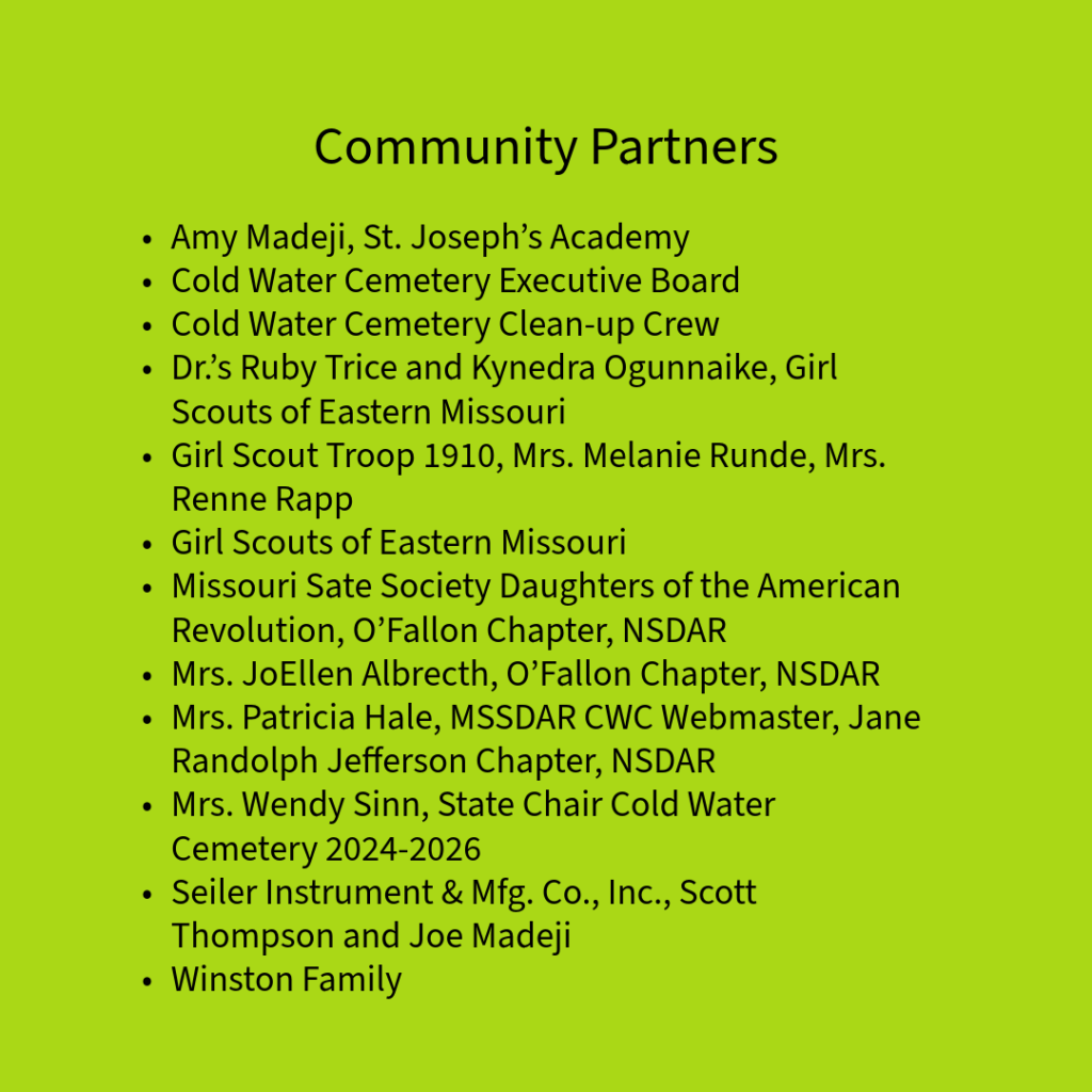 Listed on the National Register of Historic Places by the United States Department of the Interior the cemetery was dedicated on 31 May 2004, by MSSDAR. The contents herein were obtained from “A Stroll Through Coldwater Cemetery,” compiled and copyrighted by the Webster Groves Chapter National Society Daughters of the American Revolution (NSDAR or DAR), Missouri Secretary of State online death certificates, family histories, and other sources. For a full bibliography listing of sources, please contact us by using the form at the bottom of the page.